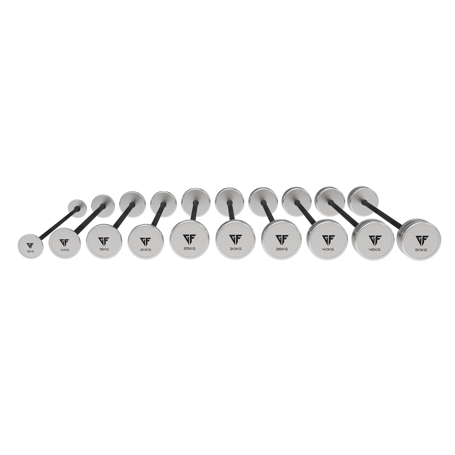 Rifliuotos rankenos užtikrina tvirtą ir stabilų suėmimą atliekant spaudimo, traukos bei kitus jėgos pratimus. Fiksuota konstrukcija garantuoja subalansuotą svorio paskirstymą ir vienodą pojūtį visame svorių diapazone.