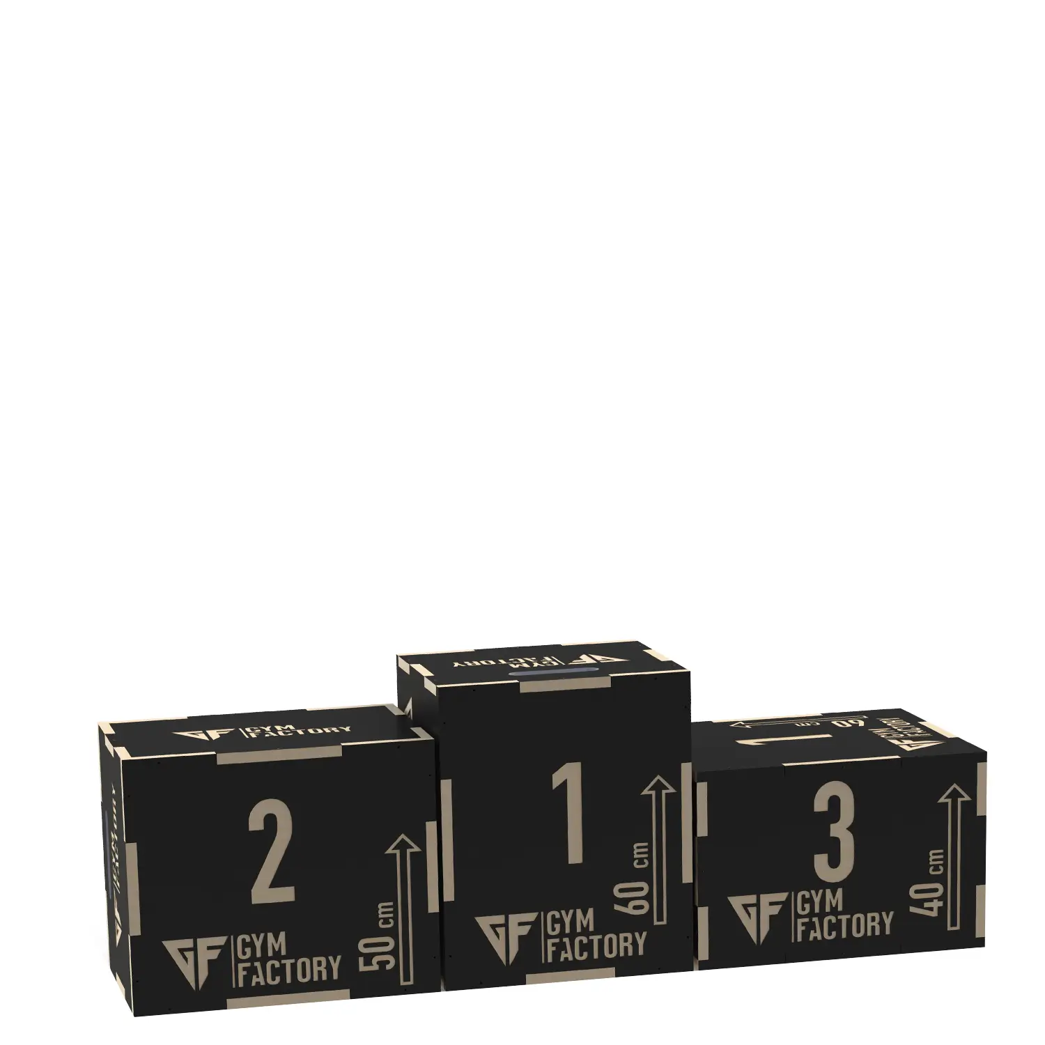 Each box has dimensions of 40 cm x 50 cm x 60 cm, allowing multiple height options by changing box orientation. The TG8 can be used individually for jump training and step-ups or combined as a victory podium for competitions and gym events.